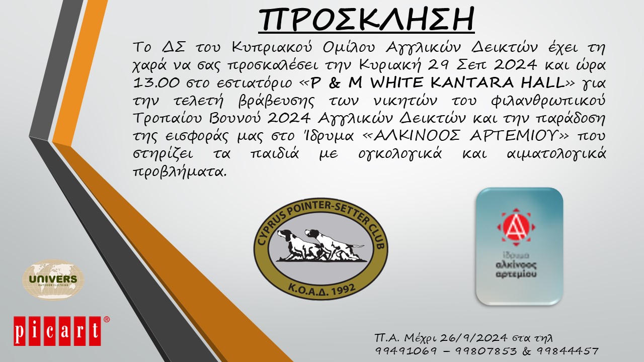 Το ΔΣ του Ομίλου προσκαλεί τα μέλη , τους φίλους και κάθε κυνόφιλο κυνηγό ιδιοκτήτη Pointer & Setter την Κυριακή 29 Σεπ 2024 και ώρα 1.00 μμ στο εστιατόριο WHITE KANTARA HALL όπου θα παρατεθεί γεύμα κατά την βράβευση των νικητών αλλά και κάθε κυναγωγού που συμμετείχε στο φιλανθρωπικό Τρόπαιο Βουνού Αγγλικών Δεικτών 2024 και την παράδοση της οικονομικής προσφοράς του Ομίλου στο Ίδρυμα “ΑΛΚΙΝΟΟΣ ΑΡΤΕΜΙΟΥ”