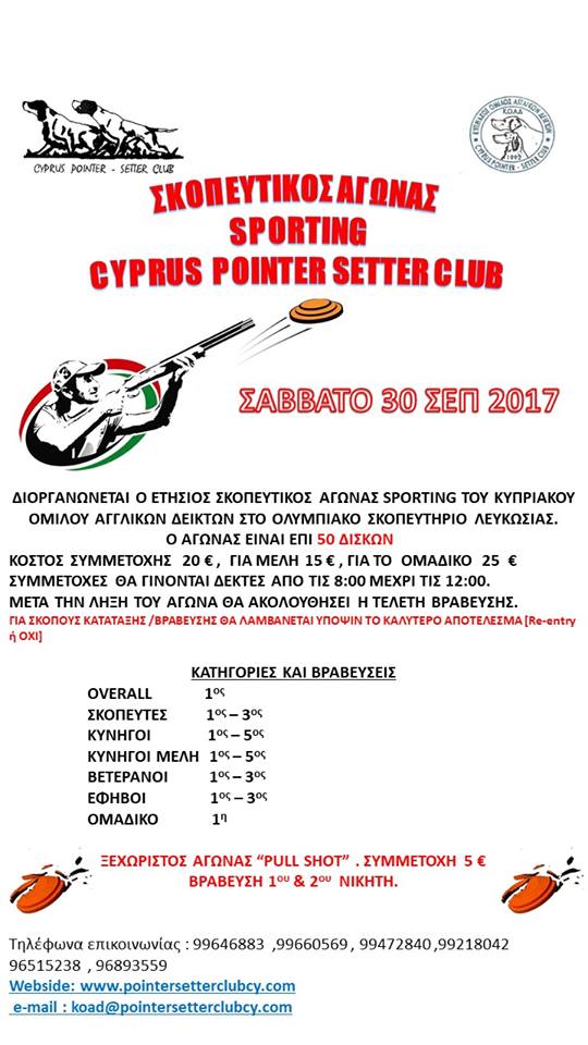 Το ΔΣ του Ομίλου πληροφορεί τα μέλη , τους φίλους ,τους σκοπευτές και κάθε κυνηγό ότι το Σάββατο 30 Σεπ 2017 διοργανώνει στο Ολυμπιακό Σκοπευτήριο Λατσιών , τον καθιερωμένο ετήσιο Σκοπευτικό Αγώνα. Η παρουσία του καθενός από εσάς ξεχωριστά αποτελεί τιμή και χαρά για εμάς.